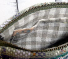 | 前回アップしたものと、続けて織った生地で、底のあるポーチを作りました。 裂き布は一種類なのですが、場所によって色の出方が違い、両面で色合いだいぶ違いました。 |